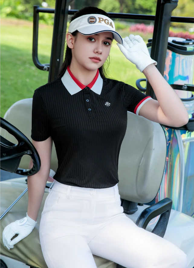 Áo cộc tay Golf nữ PGA-101427 cao cấp chính hãng thương hiệu PGA được làm từ chất liệu vải sợi Polyester + spandex cao cấp, mềm mại, có độ co dãn, đàn hồi tốt, thiết kế thoáng khí, thấm hút mồ hôi tốt giúp cho người chơi có trạng thái tốt nhất khi lên sân.